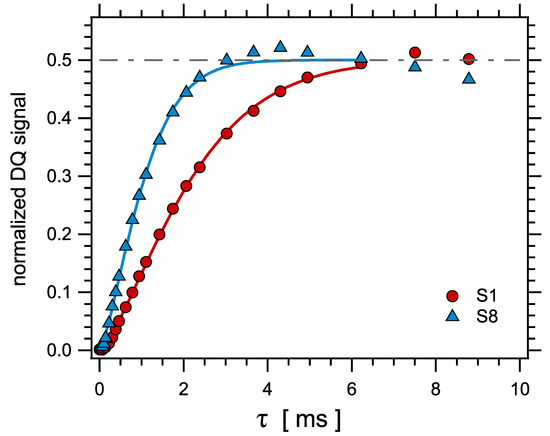 Representative normalized DQ curves obtained in samples S1 and S8. Symbols are experimental data, curves are fits with Equation (13).