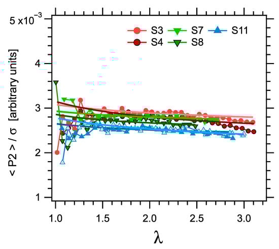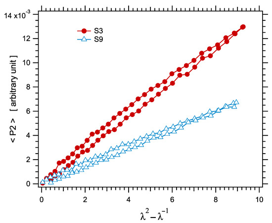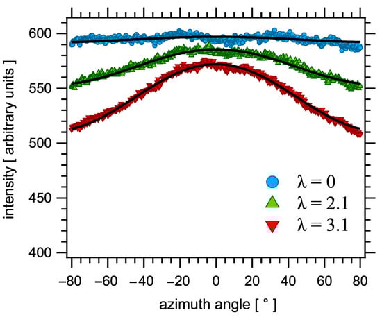 In a stretched elastomer network, it has been observed that the amorphous scattering halo, which comes from liquid-like monomer–monomer or chain–chain short range interferences, becomes anisotropic under elongation, with more intensity in directions perpendicular to the stretching direction [56,93]. Analyzing the azimuth dependence of the scattered intensity enables extracting an anisotropy parameter , where the X suffix indicates that the quantity reflects the anisotropy of the X scattering pattern. The amorphous scattering predominantly comes from inter-chain atom–atom correlation at the monomer scale, and it is difficult to relate it quantitatively to the average segmental orientation parameter [67,94]. However, based on symmetry consideration, it may be stated that is proportional to the orientation parameter introduced in Equations (2) and (3) (with a negative proportionality factor as the scattering is enhanced in the direction perpendicular to the tensile direction).
