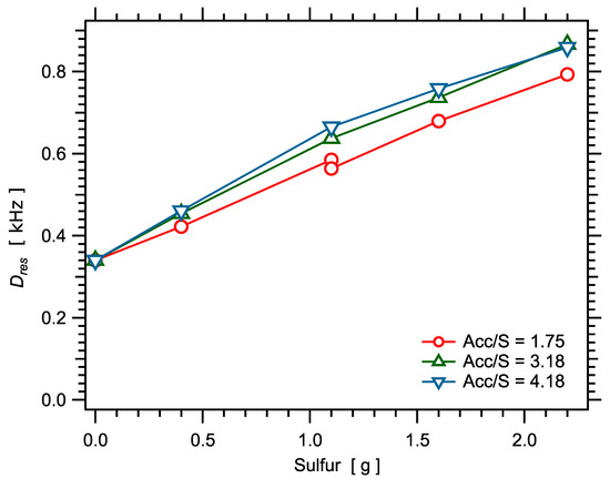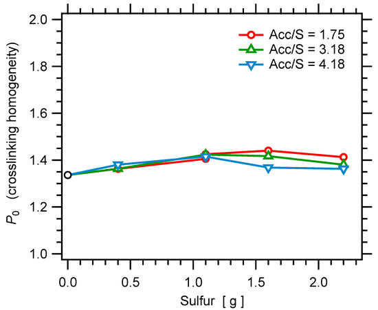 Results for the measured NMR quantity (proportional to the crosslink density) are shown in Figure 4. The nonzero value measured for zero sulfur corresponds to the contribution of entanglements. Then, for each value of the Acc/S ratio, shows a linear variation with the sulfur amount, which indicates that the same sulfur bridges (same average number of sulfur atoms per crosslink) are formed [96]. This is expected since the ratio Acc/S has to be changed in a quite large range to strongly affect the average number of sulfur per crosslink [96]. Nevertheless, the slope tends to increase as the ratio Acc/S increases, which is in qualitative agreement with previously published studies [96]. The values of the fitting parameter (which is interpreted as being related to the homogeneity of the crosslink density) show no significant variation in the whole series of unfilled samples, as shown in Figure 5. Equivalently, when plotted as a function of the rescaled time , all DQ curves fall on a single master curve. This indicates that all samples have the same degree of crosslinking homogeneity.