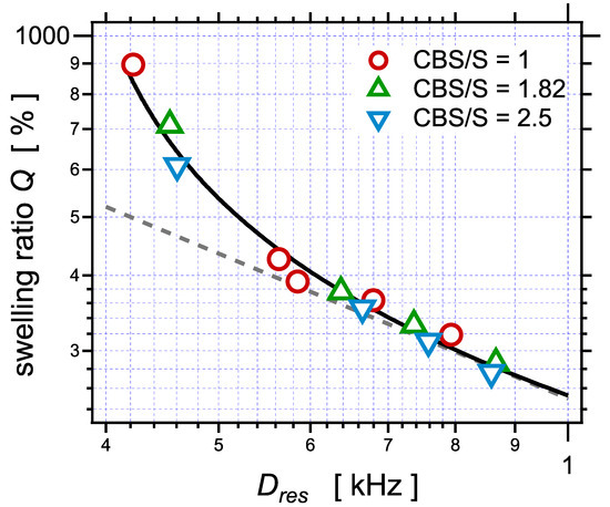 with in Hz and in kg/mol. Moreover, shown in Figure 6 is the scaling law adjusted to the experimental points in the limit of high crosslink densities. This follows from the scaling consideration that, at swelling equilibrium, the swollen gel consists in a packing of volumes occupied by one network strand of length N segments, being the average dimension of the strand swollen in good solvent, with 3/5 the Flory exponent [92]. Within such a picture, the swelling ratio then scales as .