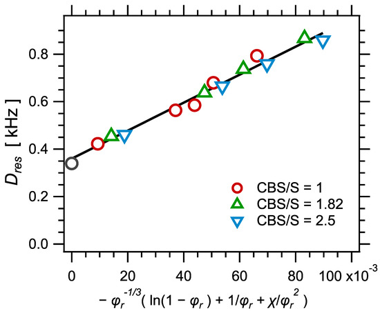 The NMR parameter as a function of the quantity , with . According to the Flory–Rehner model, Equation (11), and taking the assumption of phantom network, the relationship should be linear, which is well verified. The line is the obtained best linear fit. The ordinate at origin corresponds to the contribution of entanglements.