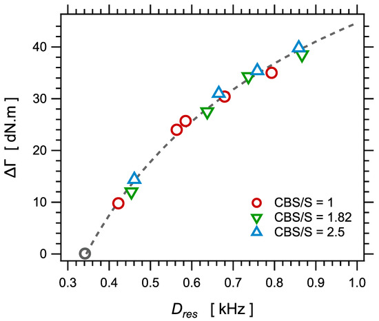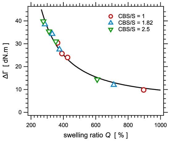 The torque increase is plotted as a function of the swelling ratio Q in Figure 9. Again, the curve can be fitted with Equation (11), as shown in the figure.