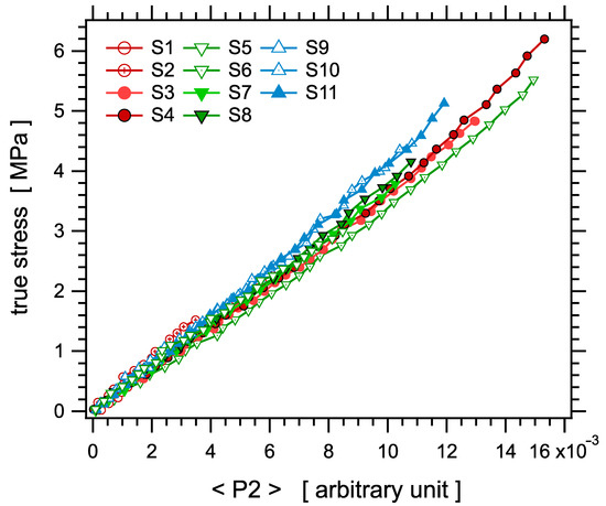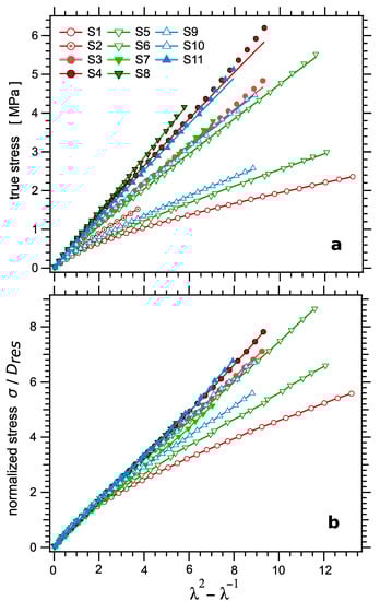 Next, the responses of the samples to uniaxial loading were investigated. The mechanical response is discussed first. The true stress curves are plotted as a function of the elongation parameter for the whole set of samples in Figure 10a. The curves can be perfectly fitted by the classical Mooney–Rivlin Equation (16) [89,90]: