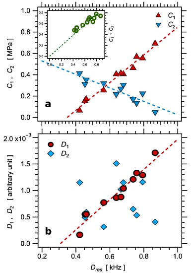 (a) TheMooney–Rivlin coefficients and fitted on the tensile stress–strain curves shown in Figure 10 as a function of . Inset: the zero strain modulus as a function of . (b) The effective Mooney–Rivlin coefficients and fitted on the curves shown in Figure 13a. Dashed lines are linear fits of corresponding data and should be considered as guides for the eye.