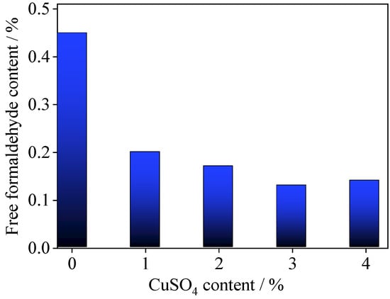 Figure 1 shows the effect of the amount of copper (II) sulfate on the free formaldehyde content of the UF adhesive. The content of free formaldehyde in the control UF adhesive was 0.45%, and it decreased with increasing copper (II) sulfate content. This was due to the oxidation of free formaldehyde by Cu2+ ions to form formate [,]. When 1% copper (II) sulfate was added to UF resin adhesive, the content of free formaldehyde decreased by 55%, surpassing the decrease (50%) achieved with an amine scavenger []. When 3% copper (II) sulfate was added to the UF resin adhesive (UF/3%CuSO4), the free formaldehyde content therein was 0.13 %, around 71% lower than that of the control UF adhesive. This free formaldehyde content is considerably lower than the value
