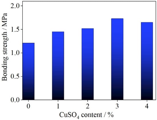 Figure 2 shows the relationship between copper (II) sulfate content in UF resin adhesive and the bonding strength of plywood. It can be seen from Figure 2 that the bonding strength of the plywood prepared without copper (II) sulfate adhesive was 1.21 MPa, and that this parameter increased with increasing copper (II) sulfate content in the range 0–3%. This is at variance with previously reported results, which implied that the content of copper (II) sulfate has little effect on bonding strength []. Our finding can be attributed to the redox reaction of copper (II) sulfate and formaldehyde generating small particles of Cu or Cu2O. According to the research of Mahrdt et al. [], the incorporation of small particles into UF resin can help to overcome the limitation of polymer composition, increase the coverage of the adhesive on a wood surface, and improve the strength of the adhesive. When the copper (II) sulfate content was 3%, the bonding strength reached 1.73 MPa, around 43% higher than that of the control UF adhesive. Ghani et al. [] reported that the adhesion strength decreased significantly with the addition of an amine as a formaldehyde scavenger. The observed deterioration in the mechanical properties was attributed to a decrease in the degree of crosslinking in the curing network [] caused by the reduction of free formaldehyde content as a result of its reaction with the amine additive.