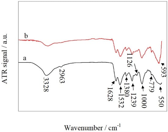 ATR-IR spectra of (a) the control UF and (b) UF/3% CuSO4.