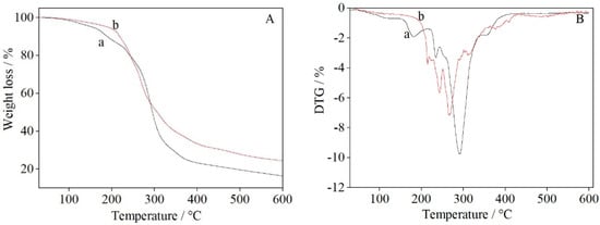 TG (A) and DTG (B) traces of (a) the control UF, and (b) UF/3% CuSO4.