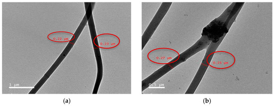 Transmission electron microscopy of prepared fibers: sample CA13 at image scale 1 μm (a), HAP particles dispersed inside the sample CA13 at image scale 0.5 μm (b) [77].