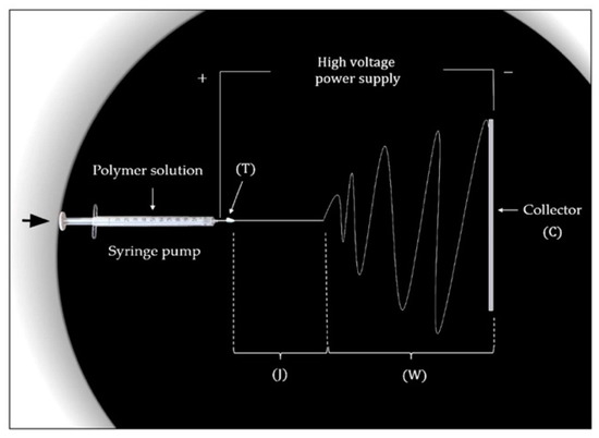 Schematic view of the electrospinning equipment with the four distinct states: Taylor cone formation area (T); stable-straight jet part (J); unstable, whipping region (W); fibers collection phase (C) [87].