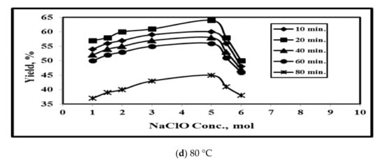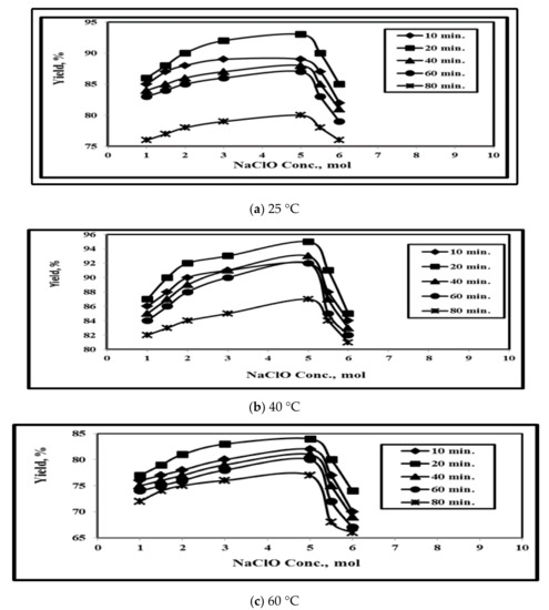 Effect of reaction time and NaClO concentration on the yield % at different test temperatures.