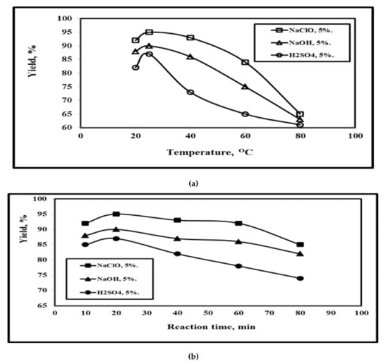 Figure 3 illustrates the dependence of reaction medium on both reaction temperatures and reaction time. Three reaction mediums were used: NaClO, NaOH, and H2SO4. Figure 3a indicates that the optimum yield temperature was 25 °C with 95%, 90%, and 87% for 5% concentration of NaClO, NaOH, and H2SO4 respectively. The yield values of the three mediums increased up to 25 °C followed by a yield decrement with temperature increment, since high temperatures reduced the reaction activity of cellulose with excessively hydrolyzed into glucose monomers, which reduced the yield of GNFC, in agreement with [16]. Also, with temperature increment; the power applied reduced the reaction activity of cellulose, so the mass transfer of the intra-finer pores of GNC is also reduced that result in the decrement of GNFC Yield with temperature increment in agreement with Lu et al. [6].