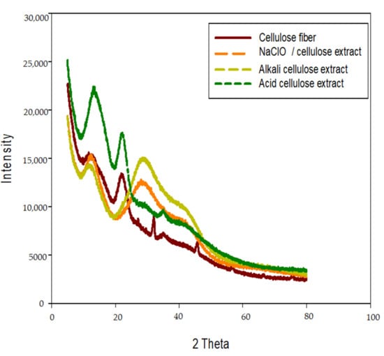 The XRD diffractogram profiles for all the test specimens are shown in Figure 4. It was clearly observed that the XRD patterns of the four specimens were similar and these slight shifts in angles and peaks proved the occurrence of cellulose in agreement with Chen et al. [8] and Maia et al. [47].