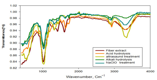 All types of treated GNFCs showed increased intensity in the bands 1025 cm−1 due to the pyranose ring stretching in agreement with Corrêa et al. [66]. According to Li [67], absorption peaks of 890 cm−1 at C-H vibration band due to the lowest cellulose vibration anomeric, specifically to β-glucosides bonds that exist between the glucose units of cellulose/hemicellulose nanofibers in the GNFC spectra, [68]. According to the infrared spectral features, the functional types of cellulose nanofibers showed that there were no distinct changes at different conditions in agreement with [69].
