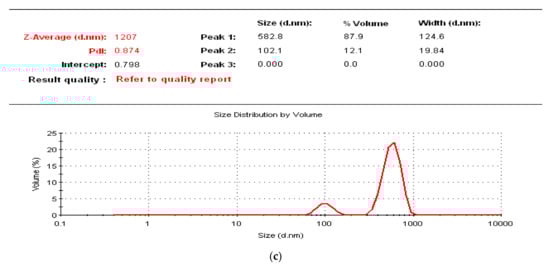 Figure 9a–c showed the size distribution of GNFC/NaClO, GNFC/NaOH, and GNFC/H2SO4 measured by particle size analysis. The size distribution by volume of GNFC/NaClO as detected by laser diffraction shown in Figure 9a. There were two peaks; minor peak (1) with mean values of volume %, size (d·nm), and width of 3.20%, 173.20 d·nm, and 32.84 d·nm, respectively, and major peak (2) with a mean values of 96.80%, 13.23 d·nm, and 1.987 d·nm, respectively. Figure 9b shows GNFC/NaOH with only one peak with mean values of 100%, 104.1 d·nm, and 15.63 d·nm, while Figure 9c shows two peaks: the minor peak (1) with mean values of 87.9%, 582.8 d·nm, and 127.6 d·nm and with mean values of the major peak (2) of 12.1%, 102.1 d·nm, and 19.84 d·nm. The results showed that the produced weighted distribution volume contained different particle size measurements while that using image analysis resulted in the most accurate results according to [68,69,70,71]. Based on the given results, GNFC/NaClO produced better size distribution data compared to GNFC/NaOH and GNFC/H2SO4. Furthermore, the particle size distribution data proved that low acid concentration hydrolysis was not sufficient to obtain GNFC/H2SO4 in agreement with Mahardika et al. [72].