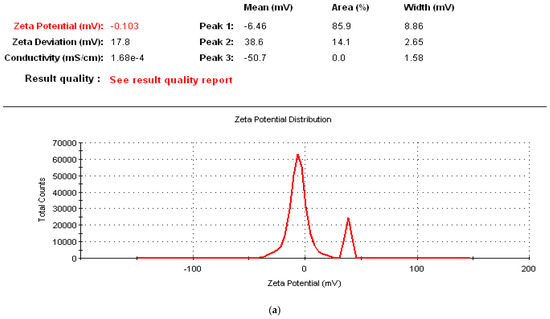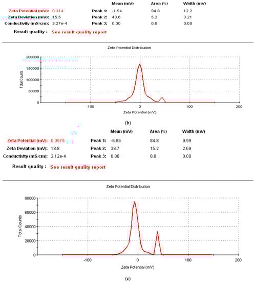 The Zeta potentials of the sonicated GNFC/NaClO, GNFC/NaOH, and GNFC/H2SO4 were measured and plotted in Figure 10. All specimen types showed a negative Zeta potential taking into consideration that the values lower than −15 mV represent the particle agglomeration starting and values higher than −30 mV indicated that sufficient mutual repulsion, resulting in a colloidal stability [73,74].