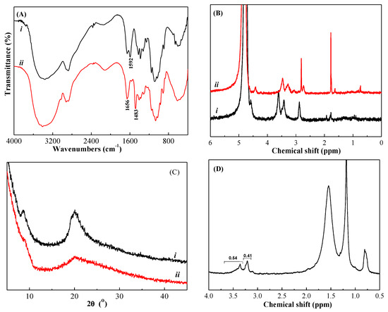 FTIR (A), 1H NMR (B) spectra and XRD patterns (C) of chitosan (i) and GTA-m-CS (ii) and 1H NMR spectra of DDEAC (D).