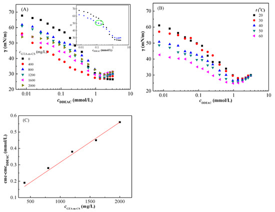 DDEAC is a kind of cationic surfactant with reactivity, and its surface activity is higher than that of dodecyltrimethyl ammonium chloride [25]. Surface tension is one of the important methods in studying the interaction between macromolecules and surfactants. The relationship between GTA-m-CS solution and DDEAC with different concentration at 20 °C is shown in Figure 2A. The concentrations of GTA-m-CS are 0, 400, 800, 1200, 1600 and 2000 mg/L. The surface tension of GTA-m-CS decreases from 63 to 50 mN/m with concentration increasing from 400 to 2000 mg/L, meaning GTA-m-CS has certain surface activity. For GTA-m-CS/DDEAC systems, the surface tension decreases quickly with increasing DDEAC concentration until the surface tension keeps almost constant. The significantly decrease of the surface tension is caused by the adsorption of DDEAC on the surface. When the surface adsorption is saturated, the surface tension keeps constant and the DDEAC molecules begin to form micelles in the bulk phase. The concentration corresponding to the initial constant surface tension is called critical micelle concentration (cmc) [30]. The surface tension at cmc is recorded as γcmc in mN/m.
