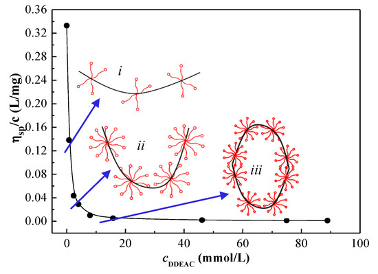 The relationship between reduced viscosity of GTA-m-CS/DDEAC and DDEAC concentration and schematic diagram of GTA-m-CS/DDEAC interaction (the insert). i—absorption of DDEAC molecules on GTA-m-CS molecule, ii—the formation of GTA-m-CS/DDEAC complexes, and iii-interaction between GTA-m-CS/DDEAC complexes.