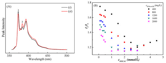 The steady-state fluorescence of GTA-m-CS/DDEAC system could also reflect the formation of micelles while pyrene is used as a probe. There are five characteristic emission bands in pyrene fluorescence spectrum within 370 to 400 nm (Figure 5A). The intensity of peak 3 is significantly affected by the environment where the pyrene molecules reside. It increases while the environment is transferred from polarity to non-polarity. With the increase of DDEAC concentration, the micelles begin to form, and pyrene molecules were solubilized. The intensity of peak 3 increases (sample ii in Figure 5A). From the plot of I1/I3 ratio against DDEAC concentration (Figure 5B), the critical micellar concentrations of 2.99 (), 2.51 (800 mg/L), 1.99 (1200 mg/L), 1.49 (1600 mg/L) and 1.00 (2000 mg/L) mmol/L are obtained. The values are consistent with those obtained from the conductivity method, and are slightly different from those obtained by the surface tension method, which is attributed to the surface activity of GTA-m-CS.