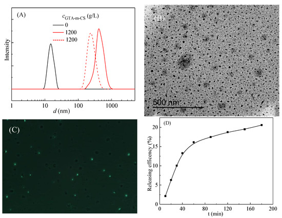 At fixed concentrations of DDEAC (3 mmol/L) and GTA-m-CS (1200 g/L), the hydrodynamic radius of curcumin loaded micelles increase from 5 nm [25] and 234 nm (dash line in Figure 6) to 15 nm and 420 nm (solid red line in Figure 6A), indicating the residence of curcumin in micelles. The TEM images of curcumin loaded GTA-m-CS micelles confirm the formation of micelles (Figure 6B), which diameter ranges from 42.86 nm to 83.04 nm with an average diameter of 61.89 nm. The diameter is much smaller than that measured by DLS, which is attributed to the different working principles of the two methods. Fluorescence confocal microscopic (Figure 6C) shows that the curcumin-loaded micelles are monodispersed. The zeta potential of GTA-m-CS/DDEAC complex decreases slightly from 28.32 ± 3.57 mV to 20.13 ± 2.69 mV after the encapsulation of curcumin. This is attributed to the hydrophobic interactions between curcumin and DDEAC and –CH3, shielding the positive electricity of . The curcumin encapsulation efficiency (CEE) is 31.63 ± 2.37%, which is lower than that encapsulated in Tween 85 [44], Pluronic F127 [45] and other nanoemulsion systems [46]. This is due to the competitive interaction between curcumin, DDEAC and GTA-m-CS.