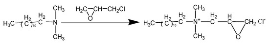 - Liu, Y.; Yang, X.; Li, Y.; Chen, Y.; Zhou, X.; Li, T. Synthesis and characterization of the epoxy-functionalized quaternary ammonium chloride. Colloids Surf. A Physicochem. Eng. Asp. 2016, 498, 248–257. [Google Scholar] [CrossRef]