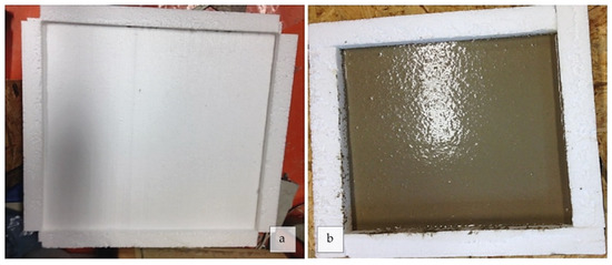 Preparation of three (a) polystyrene boards (500 × 500 mm2) for testing the fire resistance: (b) the GF (300 × 300 mm2) was coated on them with different thicknesses (20, 15, 10 mm).