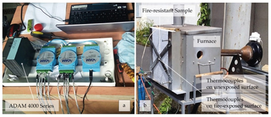 The equipment as illustrated in Figure 3 was used to test the fire resistance according to CSN EN 13381-3 [43] by the technical committee of the Technical University of Liberec. The test furnace was heated with natural gas and the heating rate was controlled according to ISO 834-11:2014 standard [44]. In addition, the deformation of the steel plates and, e.g., warping defects of polystyrene were used as indicators for the fire resistance performance of the samples. The temperatures of the unexposed and exposed surfaces of the samples were measured using in-built thermocouples connected through the ADAM 4000 series system. Thermocouples K5 and K9 were located on the inner side of the furnace while thermocouples K1 and K8 were on the outer side.