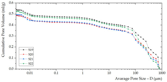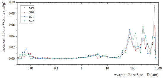 Porosity distribution within the foamed geopolymer foams S19, S20, S21, and S22 was identified through the average pore size (D) versus incremental pore volume.