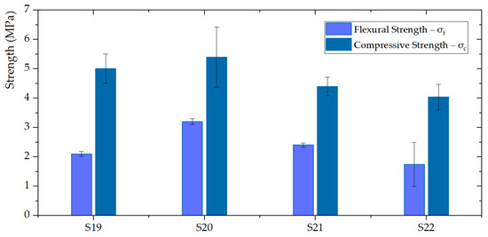 The mechanical properties (compressive (σc) and flexural (σf) strengths) of GFs are presented in Figure 6. The flexural and compressive strengths of S20 (3.2 MPa and 5.4 MPa) increased compared to S19 (2.1 MPa and 5 MPa). On the other hand, the compression strength of S21 and S22 are 12% and 19.2% smaller than S19. The reason for this slight decrease is the differential amount in the content of silica fume. The structure of the geopolymer is affected by prominent changes when the silica fume is added, creating additional voids.