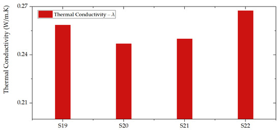 Thermal activation is always required during the synthesis of geopolymer foams. Temperature significantly accelerates the initial process of GFs formation and thus has an essential effect on curing the process, especially in the initial time of the reactions. The excellent resistance of geopolymers to temperature changes makes them suitable for working in unfavorable conditions. The thermal conductivity (λ) of GFs is illustrated in Figure 7. Samples containing 20 wt.% of silica fume have greater λ than the samples containing less amount (5% and 10 wt.%). Sample S22 presents the highest λ (0.27 W/mK). On the contrary, sample S20 is the one with the lowest λ (0.25 W/mK). S20 and S21 with 5 wt.% and 10 wt.% of silica fume have lower λ than S19 without silica fume.