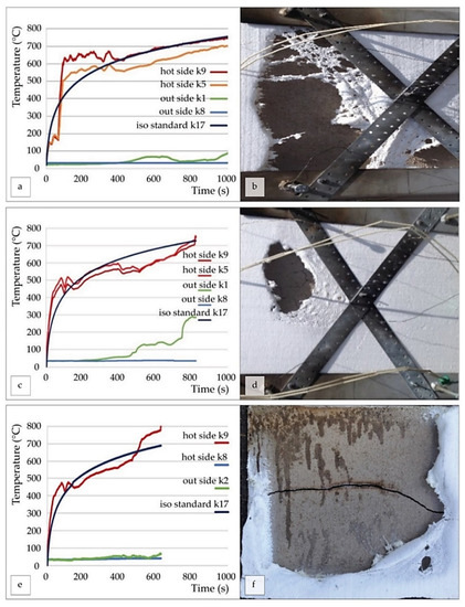 Fire resistance curves (a,c,e) and the outer surface of S20 (20, 15, 10 mm thick) after testing (b,d,f); K5, K9 and K1, K8 are the inner and outer thermocouples; K17 is the standard curve.