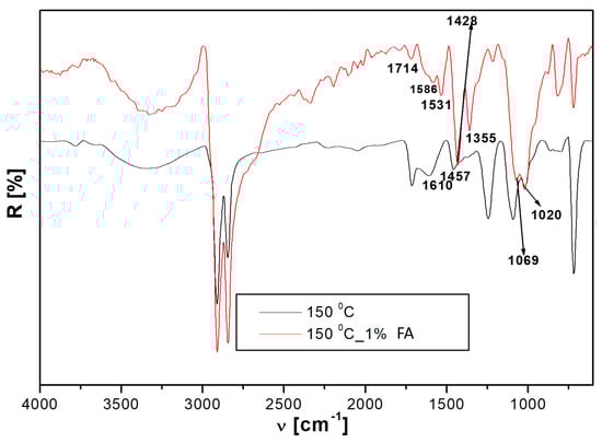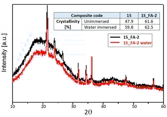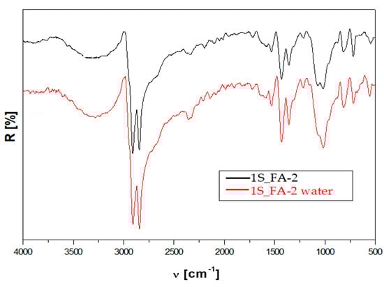 - The shift to higher wave numbers of 2842, 1722, 1369, 1219, and 719 cm−1 bands. These changes clearly indicate the increased rigidity of the composite structure, as explained by the plasticizing effect of the water in the composite capillaries. The FTIR results confirmed the mechanical test results, which registered an increase in the compression strength and stable tensile strength to water in the 1S_FA—2 sample.