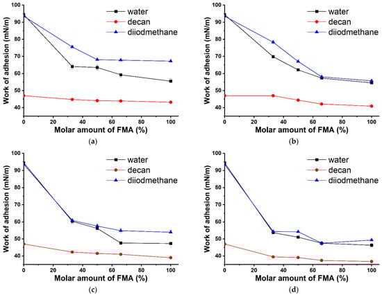 Change in the work of adhesion of the test liquids (water, n-decane, and diiodomethane) on the surface of glasses modified with FMA- and GMA-based copolymers as a function of the FMA content in the copolymer: (a) poly-(TEMA-co-GMA); (b) poly-(HFMA-co-GMA); (c) poly-(HIMA-co-GMA); (d) poly-(HBMA-co-GMA).