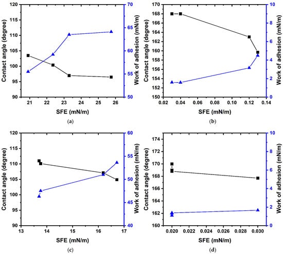Dependence of the contact angle and the work of adhesion on the surface free energy for grafted coatings based on the poly-(TEMA-co-GMA) ((a)—glass; (b)—textured aluminum) and poly-(HBMA-co-GMA) copolymers ((c)—glass; (d)—textured aluminum).