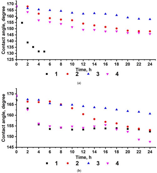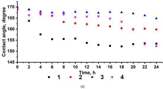However, the achievement of high contact angles does not allow us to conclude that the superhydrophobic properties of coatings are stable [60]. The instability of the superhydrophobic state manifests itself as a change in the wetting regime from heterogeneous to homogeneous, which coincides with a significant decrease in the wetting angle. Assuming a long contact time, a decrease in the wetting angle may be due to the penetration of water into the rough surface or interaction with oxygen-containing groups in defective areas of the coating with the formation of a new wetting surface.