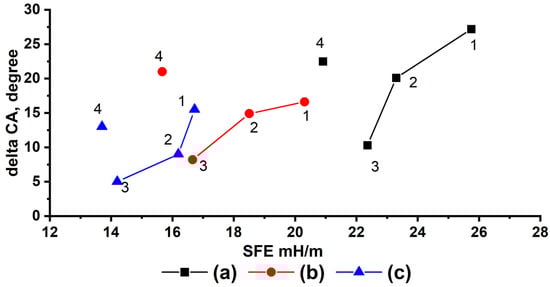 Dependence of the change of wetting angle after 24 h of contact of a water droplet with the textured aluminum surface modified with (a) poly-(TEMA-co-GMA); (b) poly-(HIMA-co-GMA); and (c) poly-(HBMA-co-GMA) from the surface free energy with varying FMA contents of the copolymer (1—33%; 2—50%; 3—66%; 4—100%).