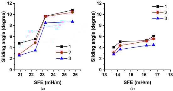 Changes in the roll-off angles of water droplets from the surface of the textured aluminum samples as a function of the surface free energy of the polymer coating at different rates of inclination: (a) poly-(TEMA-co-GMA); (b) poly-(HBMA-co-GMA): 1—0.37°/s; 2—0.61°/s; 3—1.1°/s.