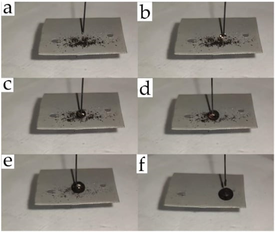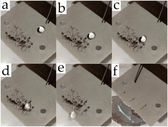 Demonstration of the self-cleaning effect as a result of the collection of soil particles from the superhydrophobic aluminum surface due to the movement of a water droplet across the surface: (a) 0; (b) 3; (c) 6; (d) 9; (e) 18; (f) 45 s.
