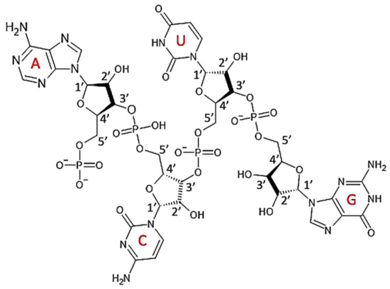 Single-strand DNA fragment drawn using ACD/ChemSketch. Red letter represents a nitrogenous base: A—adenine, C—cytosine, T—thymine, and G—guanine.