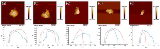 To further study the thickness of microcrystalline cellulose sheets, the AFM images are shown in Figure 2. When the PTFE addition varied from 0.2–2 wt%, the thickness of the microcrystalline cellulose flakes gradually decreased from 350 nm to about 200 nm. However, with further increase of the PTFE addition, the thickness of the particles did not decrease significantly. In the process of ball milling, MCC particles and PTFE micro powder were subjected to pressure and shear force at the same time, resulting in instantaneous high temperature and high pressure [26,27,28]. As a result of friction and collision, MCC was broken into small particles and PTFE molecular chain was transferred to the cellulose surface. Thus, flat MCC particles coated with PTFE were formed. Due to the small friction coefficient of PTFE, which produced a lubricating effect and prevented the further transfer of excess PTFE to the cellulose surface, the thickness of the coated MCC particles did not decrease sharply when 4% PTFE was added.