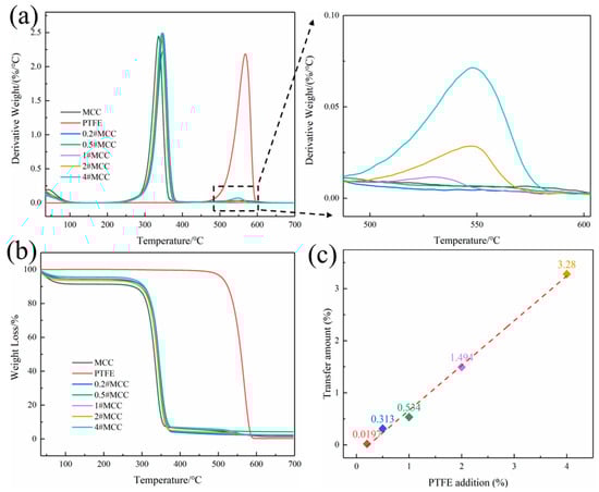 (a) DTG curves of PTFE and N#MCC samples; (b) TGA curves of PTFE and N#MCC samples; (c) Transfer amount of PTFE at different PTFE addition.