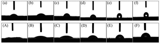 Water contact angle of (a) 0#MCC, (b) 0.2#MCC, (c) 0.5#MCC, (d) 1#MCC, (e) 2#MCC, (f) 4#MCC; DMF contact angle of (A) 0#MCC, (B) 0.2#MCC, (C) 0.5#MCC, (D) 1#MCC, (E) 2#MCC, (F) 4#MCC.