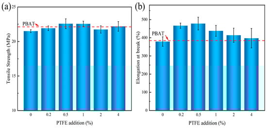 Mechanical properties of PBAT/N#MCC composites with different additions of PTFE (a) tensile strength, (b) elongation at break.
