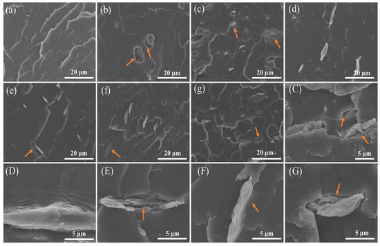 SEM fractography of composites, (a) pure PBAT, ×2k, (b) PBAT/0#MCC, ×2k, (c) PBAT/0.2#MCC, ×2k, (d) PBAT/0.5#MCC, ×2k, (e) PBAT/1#MCC, ×2k, (f) PBAT/2#MCC, ×2k, (g) PBAT/4#MCC, ×2k, (C) PBAT/0.2#MCC, ×5k, (D) PBAT/0.5#MCC, ×10k, (E) PBAT/1#MCC, ×8k, (F) PBAT/2#MCC, ×8k, (G) PBAT/4#MCC, ×10k.
