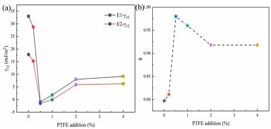 For the same polymer matrix, the change of surface free energy of filler will cause the change of interface energy and adhesion work. the interfacial energy E1-γ12 and E2-γ12 were calculated according to the harmonic mean Equation (2) and the geometric mean Equation (3), and Equations (2)–(4) was used to calculate the interfacial interaction parameters respectively, the results were showed in Figure 7a,b and Table 2. The interface energy represents the free energy required for the combination of two different interfaces. The smaller the interface energy, the less the free energy provided by the outside is required for the interface combination between the two phases. With the increase of PTFE addition, the interface energy between modified MCC and PBAT first decreased and then increased to become stable. The minimum value appeared when the PTFE addition was 0.5%, and the trend of the results calculated by the two formulas was consistent (Figure 7a). In addition, the higher the adhesion work, the more work required to separate the material and the better the mechanical properties of the material. Here, the interaction parameter φ was used to represent the magnitude of the adhesion work, and the closer the φ value was to 1, indicating that the higher the two-phase adhesion work and the greater the interfacial adhesion strength. As shown in Figure 7b, with the increase of PTFE addition, the interaction parameters between modified MCC and PBAT first increased and then decreased to a stable level. When the PTFE addition was 0.5%, the maximum value of φ was 0.98, which was very close to 1, indicating that 0.5#MCC and PBAT had very high interfacial adhesion strength, which was consistent with the results observed by SEM and mechanical performance. Thus, it can be concluded that strong cellulose/polymer interaction is conducive to stress transfer and enhance mechanical properties [37].