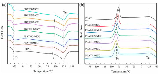 DSC results for PBAT/N#MCC composites, (a) the second heating scan, (b) the second cooling scan.