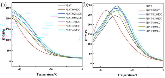DMA results for PBAT/N#MCC composites, (a) storage modulus, (b) loss modulus.