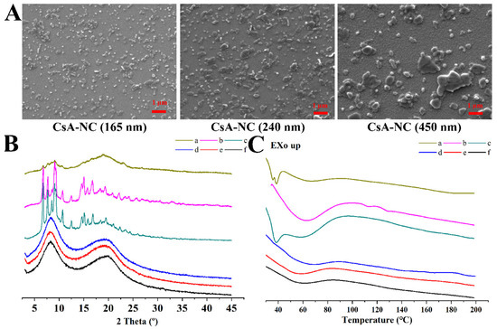Physicochemical characterizations of various formulations. (A) SEM of various CsA-NCs; (B) XRD spectra; (C) DSC thermograms. (a) stabilizers; (b) free CsA; (c) physical mixture; (d) CsA-NC (450 nm); (e) CsA-NC (240 nm); (f) CsA-NC (165 nm).