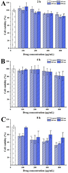 Concentration-dependent cytotoxicity of different sized CsA-NCs in Caco-2 cells at 2 h (A), 4 h (B) and 8 h (C) (n = 6, means ± SD). * represents significantly different compared with control (p < 0.05); ** represents extremely significantly different with control (p < 0.01).